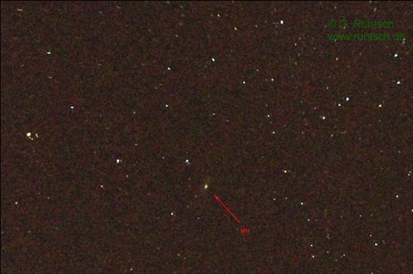 Aufnahme Blende: 3,7, Belichtungszeit: 8 Sek., 400 ASA, mit einer handelsübliche Digitalkamera 10 fach Zoom = 63 mm Brennweite auf einem Fotostativ fest montiert. |